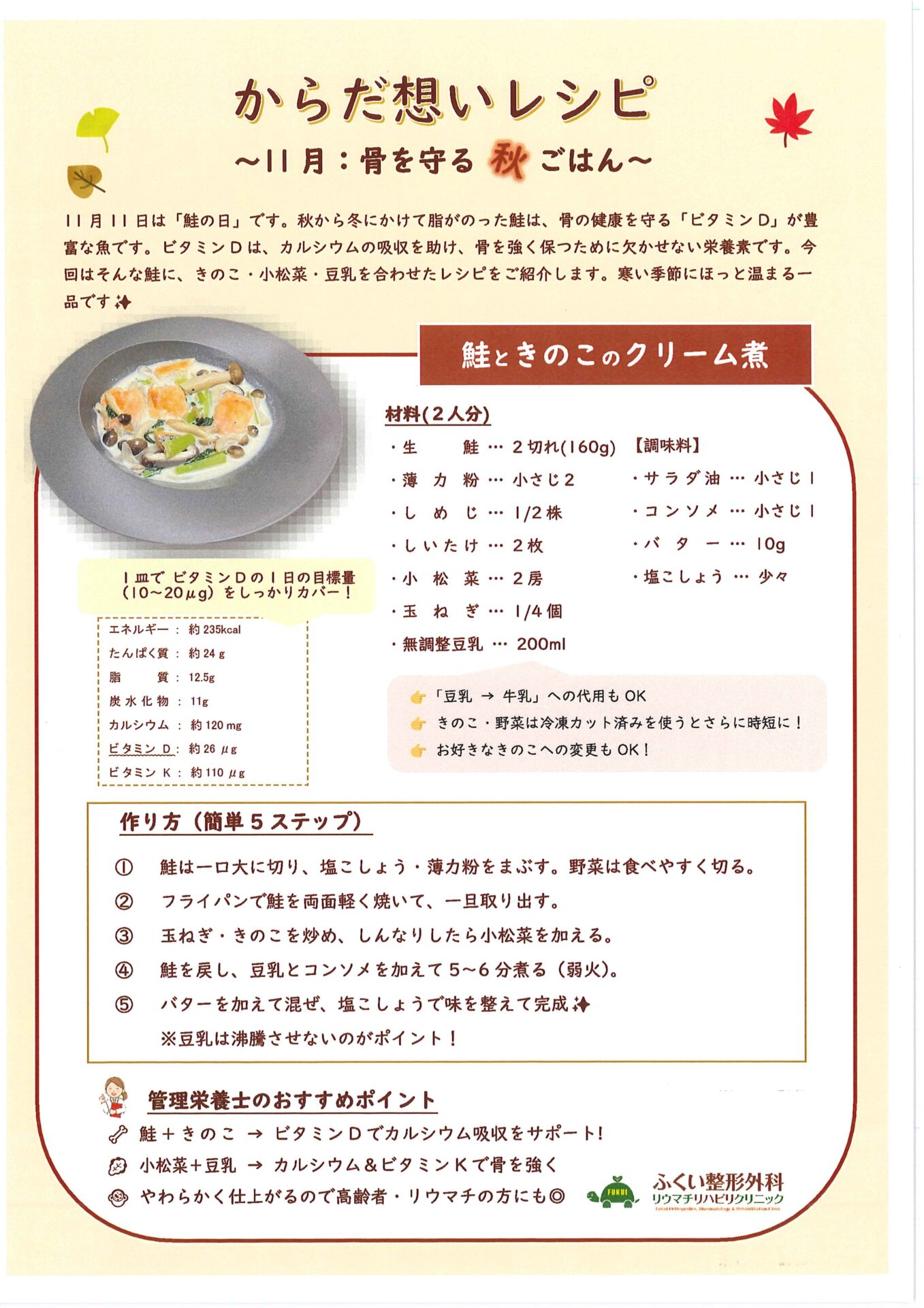 からだ想いレシピ                11月:骨を守る秋ごはん   鮭ときのこのクリーム煮