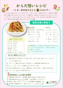 4月6日は「春巻きの日」です。「春(4月)」と「巻き(6日)」の語呂合わせから、春の訪れと健康を願って春巻きを食べる日とされています🌸この春巻きは、良質なたんぱく質やカルシウムをしっかりとることができ、やわらかく食べやすいです。冷めてもおいしいため、お弁当などの持ち運びにも向いており、新年度の食事に無理なく取り入れていただけます😊 ✨